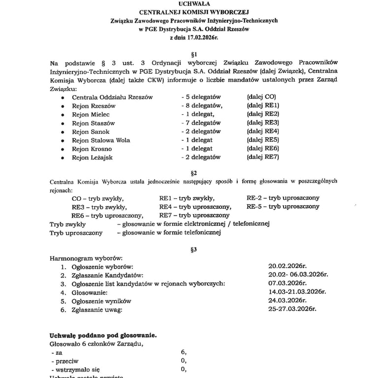 W związku z zbliżającymi się wyborami delegatów w roku 2026 przedstawiamy harmonogram jak i uchwały podjęte w związku z nimi.